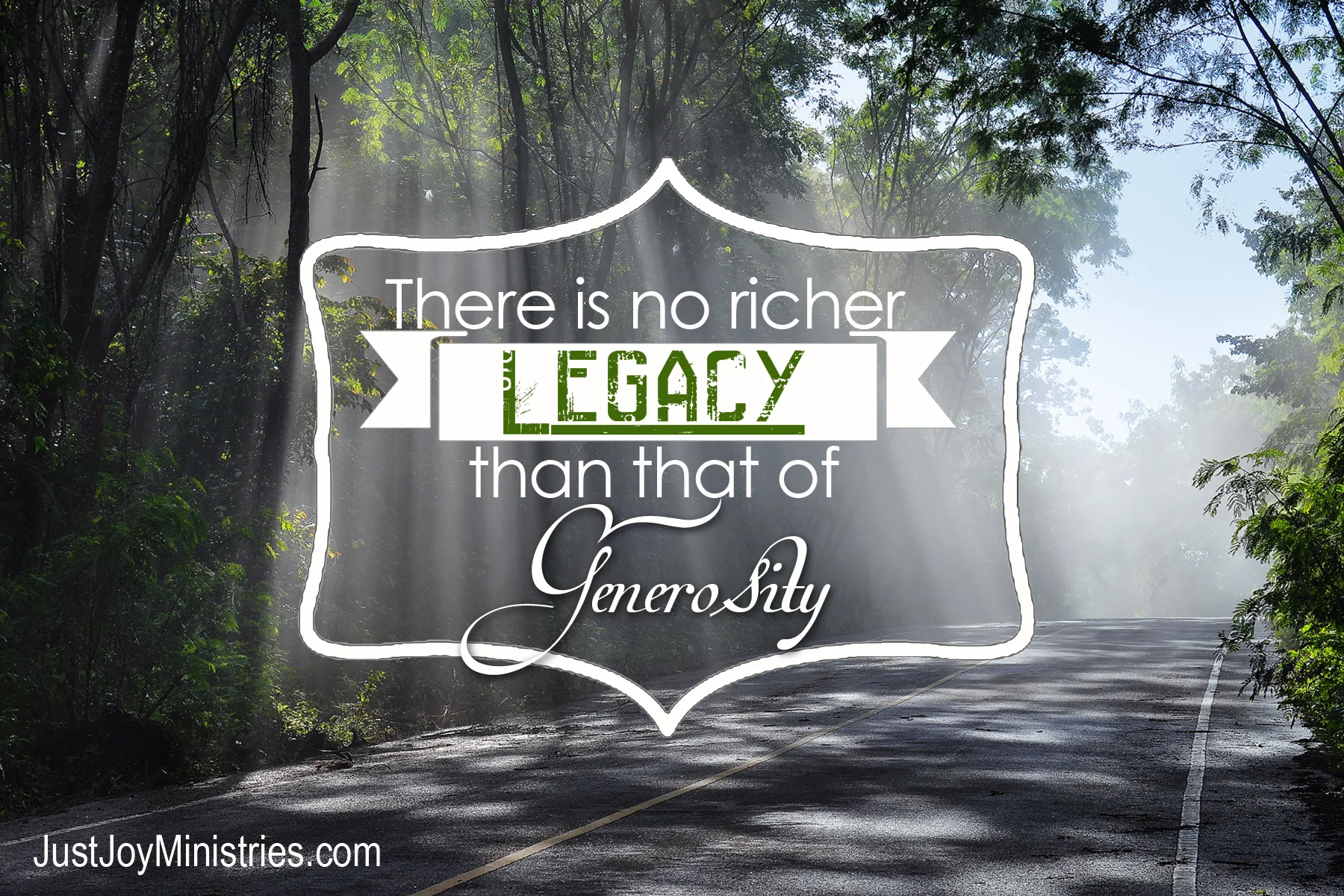 One of the greatest legacies that a person can leave to his or her family is the endowment of generosity. Some people might mistakenly believe that it costs too much to be generous but what is actual truth is that no one can afford to be selfish. When I choose to be greedy and am continuously hoarding what I have been given, the price that is exacted from my life and from the lives of those around me, is too expensive to pay.